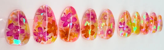 Shiny flowers (real flowers encapsulated in gel with holographic glitter)